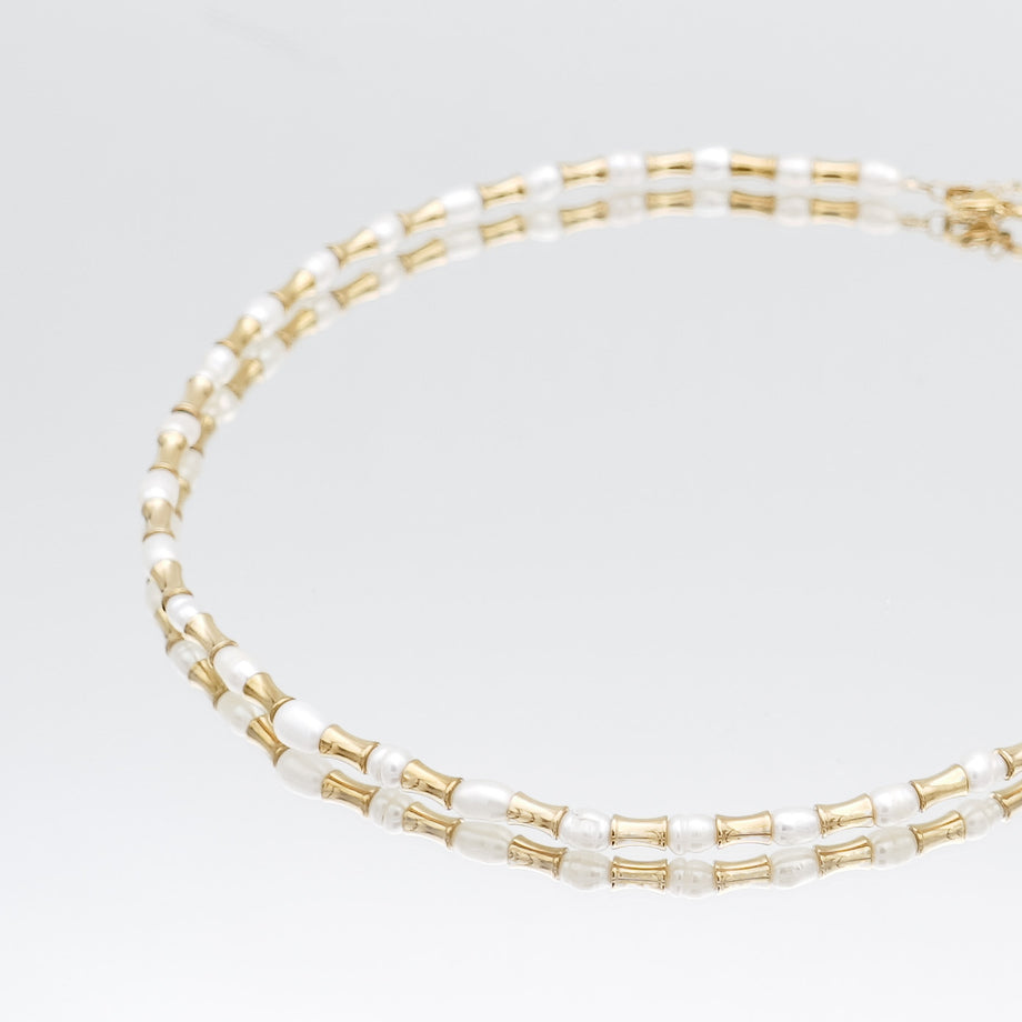 The Eden Pearl Bead Necklace, features delicate gold plated bamboo shaped beads and lustrous pearls from PRYA
