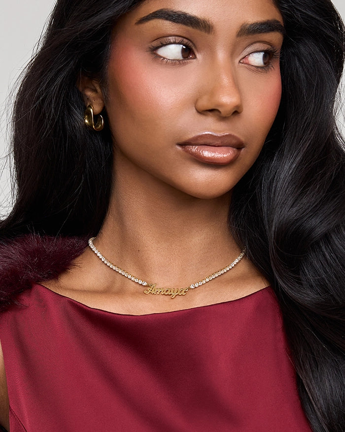 • model wearing a PRYA gold Icy Arabic Name Necklace Gold personalised icy arabic name necklace from prya