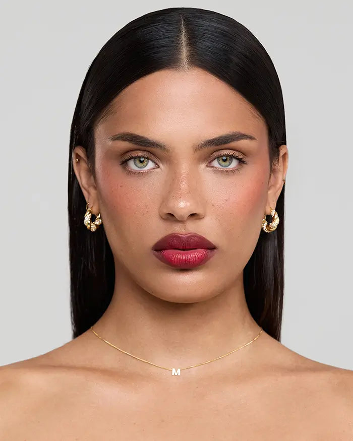 model wearing icy bubble letter initial necklace, pave o fro prya Icy Bubble letter initial necklace in silver or gold from Prya