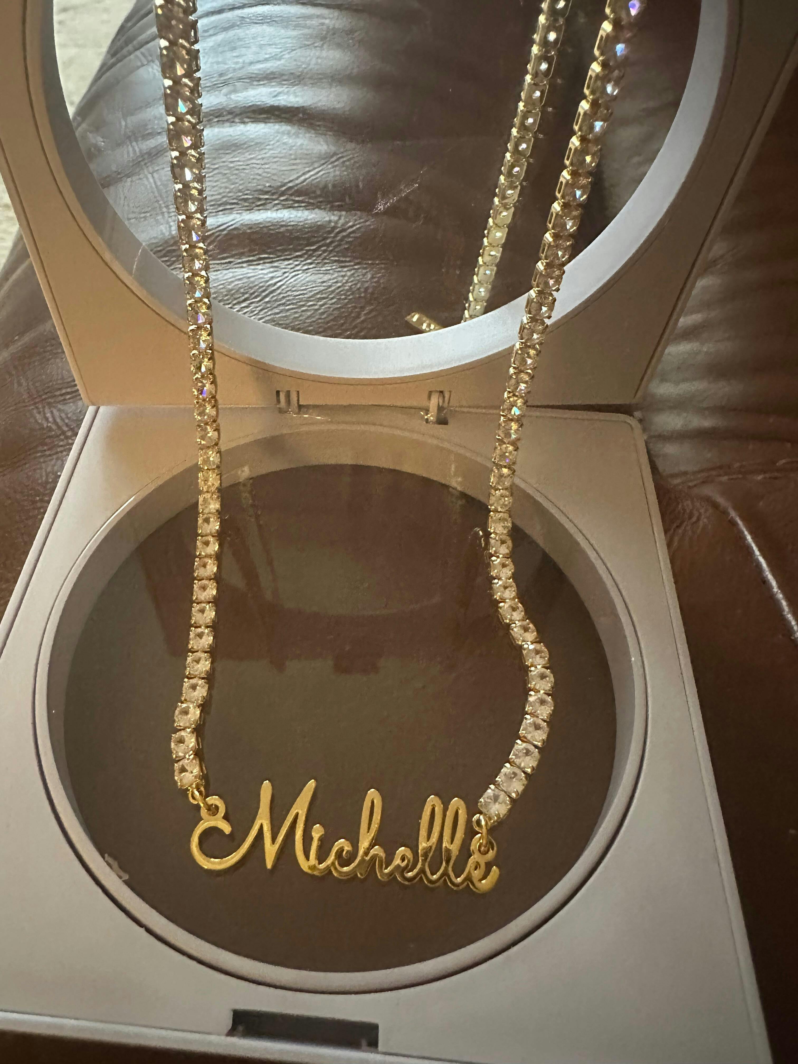 First thing I noticed was the great quality of the jewellery, then how finely crafted each individual name was made. If I had to changed something it would be to make the chain longer since I put 5 names on it. But overall beautiful!