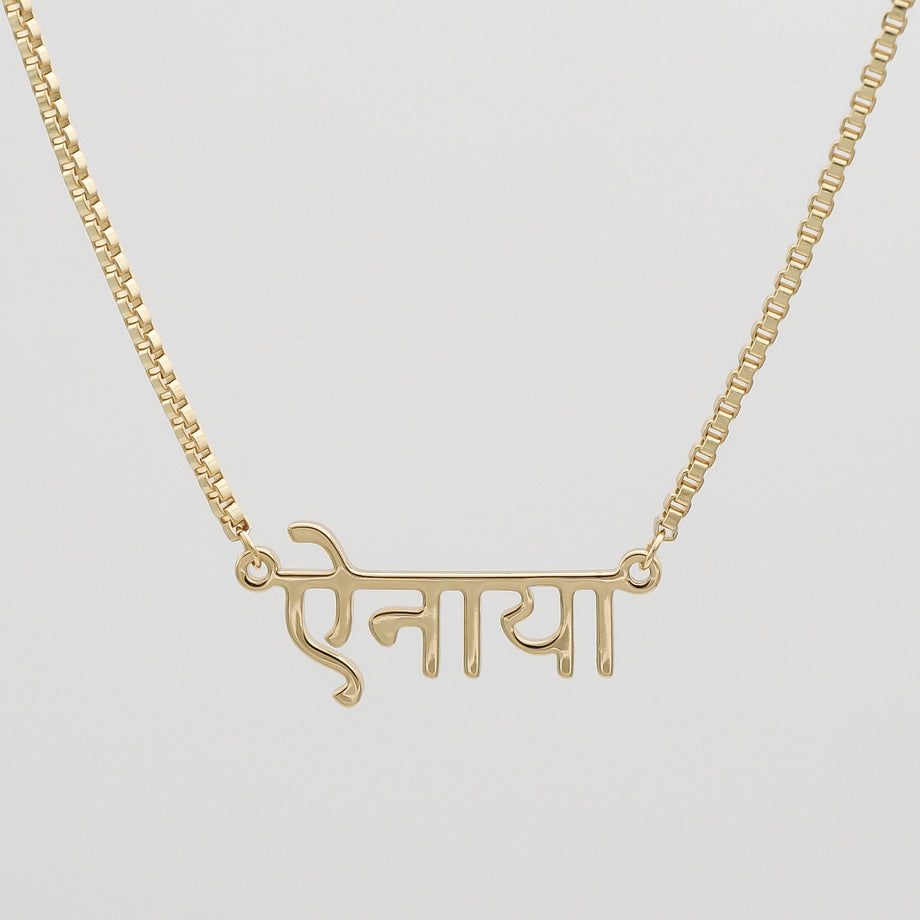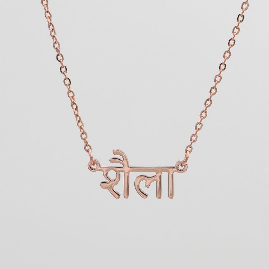 Our custom Hindi Name Necklace is crafted to showcase the beauty of Sanskrit/ Hindi script. Personalised with your chosen name or word, each piece is formed from solid metal with a slim, elegant design.  The nameplate is set in thin proportions, with the width determined by the number of characters, ensuring it sits flush against the chest.  This gorgeous custom piece is sure to become a favourite you’ll never want to take off.