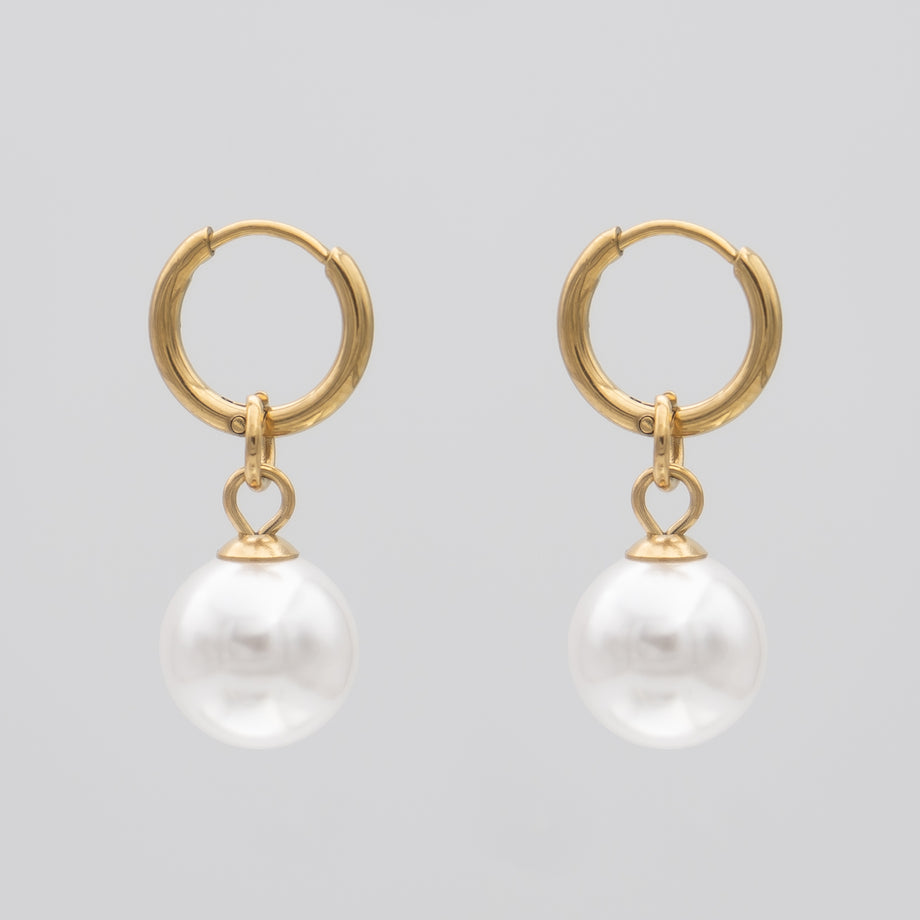 Thin Gold Hoop Phoebe Earrings with White Pearl drop Charms