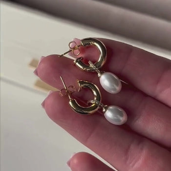 Meet your new jewellery obsession – the Nala Pearl Drop earrings . Featuring silky, iridescent pearls paired with 18k gold-plated hoops encrusted in cubic zirconia, these statement drops radiate elegance and shine. Each pearl is expertly polished for a luminous finish, creating the perfect blend of classic and modern. A must-have for dressing up any look.