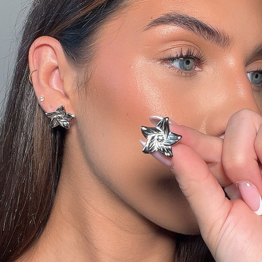 model wearing Camilla Flower Earrings feature a stunning design inspired by beautiful lilies, crafted in silver plated stainless steel